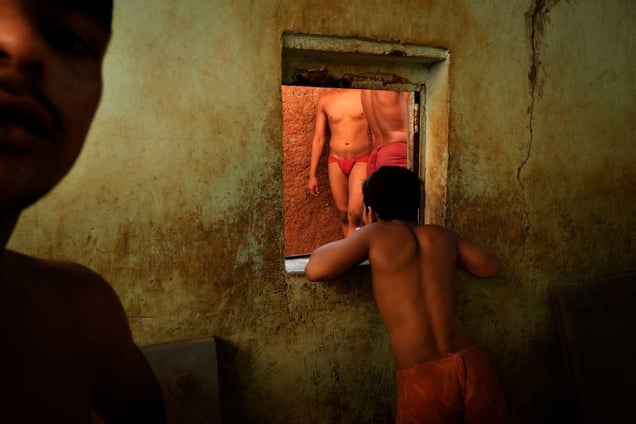 For long periods (between 6 - 12 months), wrestlers in training dedicate their bodies and souls to Kushti. Living at the Akhara, training begins with mastering self-control and learning to respect others which brings great pride and glory to practitioners of the sport. Wrestlers are bound by extremely strict rules, training 365 days a year even in the summer when temperatures reach 40°. Up at 5am to workout till 8-9am, then they break until 4pm when for the next 2 hours, skirmishes in the arena start up again. A cold shower outside with a simple hose or bucket over the head follows. Dietary rules are specific: essentially, almonds, milk, ghee and chapatis (traditional bread). Younger boys (7 -8 years old), new recruits and beginners handle all the peripheral services necessary for the smooth running of the Akhara where everyone lives. During the monsoon, they sleep together under large mosquito nets erected around the pit.