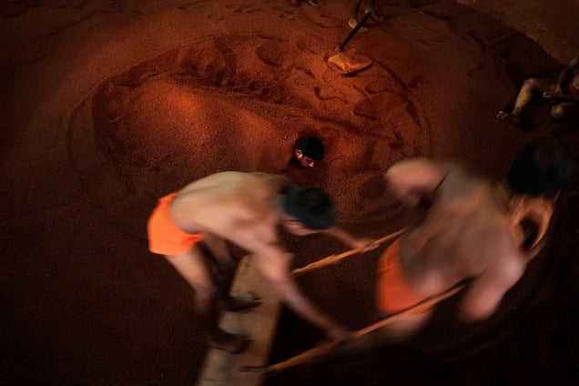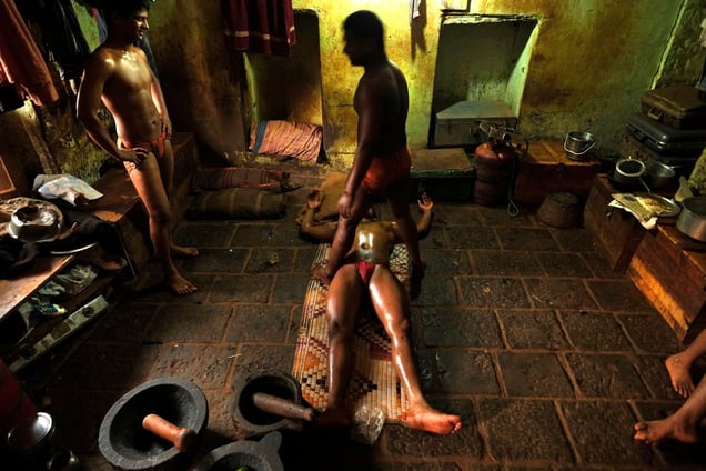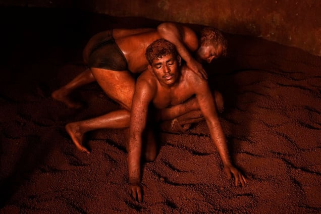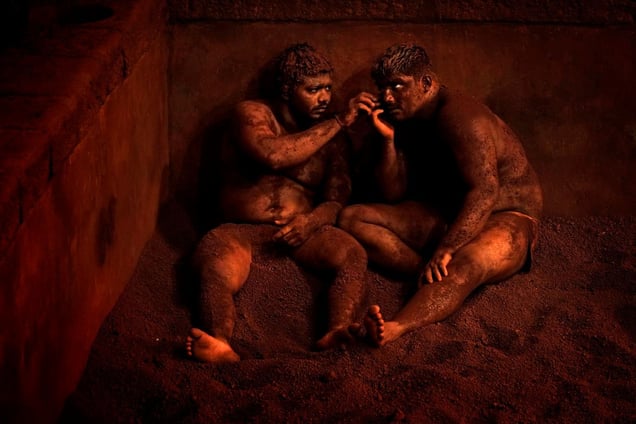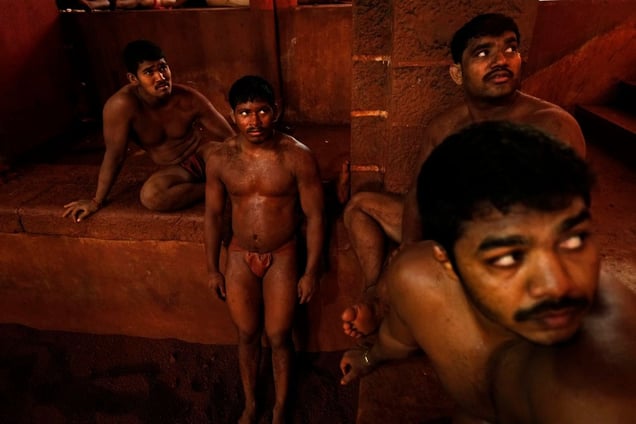 At the end of a workout, wrestlers rest against the walls of the arena covering their heads and bodies with earth to soak up any perspiration and avoid catching cold. This relaxation ceremony is completed with massages to soothe tired muscles and demonstrate mutual respect. These massages, which require close contact between the men, create an atmosphere of social unity while the earth of the Akhara tones the organism and prevents illness. Living together promotes camaraderie, solidarity and fraternity in this universe where time has stood still.