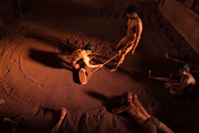 Wearing only a well-adjusted loincloth (« langot »), wrestlers or « Pelwhans » enter a pit made of clay, often mixed with salt, lemon and ghee (clarified butter). This clay, representing Mother Earth is renewed every 2 years. Before every match, each wrestler covers the body of his adversary with this earth whose color varies by region (red in Kolhapur, yellow in Varanasi). During combat, the coated bodies meld with the color of the arena.
