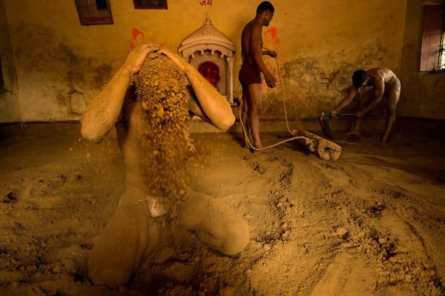This spartan existence aims to awaken the sense of self and role in the world. Participants exert themselves physically but also on a moral, spiritual and social level. From the moment they enter the Akhara, the sacred arena, strip down and coat their bodies with clay, they become all equal. Here, there are no castes. Wrestlers of all ages and professions co-habitate. Sons of prosperous families, peasants, businessmen,... The hierarchy is built solely on strength and capabilities, yet physical strength is not a goal, but rather a means to control muscles as well as the soul.