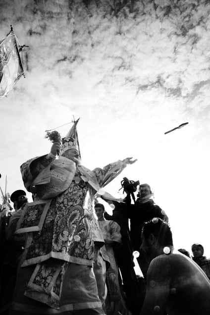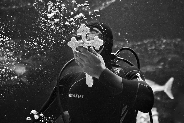 This Great Blessing takes place within the church, onto a special platform supporting a container full of holy water. The believers must have fasted, at least one day, to drink the holy water. After the church ceremony completes, follows the dive of the Christian cross to the sea, a nearby river or lake.”
