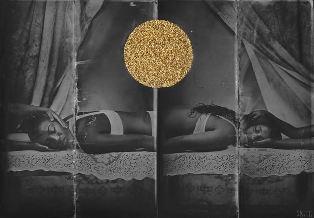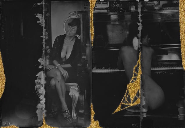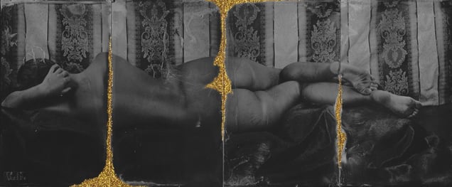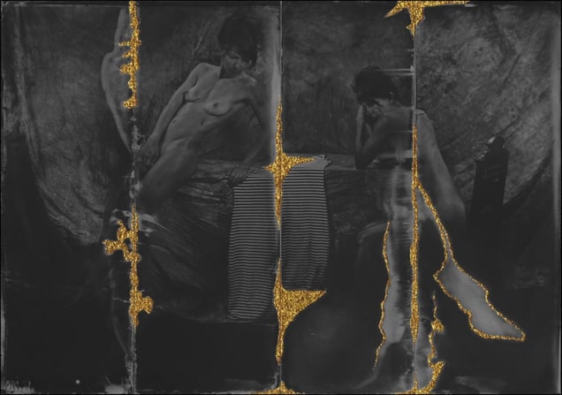 My series ''Golden Scars" came as inspiration from Kintsukuroi, Japanese art of repairing pottery with gold or silver lacquer and understanding that the piece is more beautiful for having been broken. I want to stimulate viewers to think, to make their own interpretations and associations. About who and what we are and why we act the way we do. I have been working on this series using an aluminum plates from the skip and photographing my subjecs by 80 years old Eastman Kodak large format camera, wet plate collodion Tintype process.