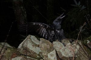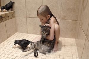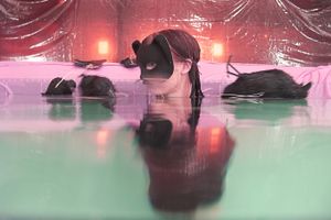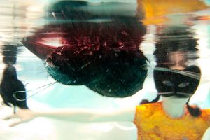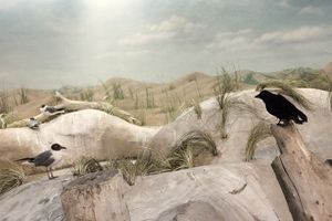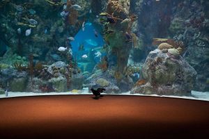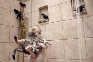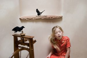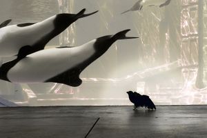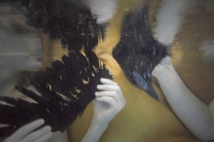 In A Murder of Crows - An Evolutionary Disaster, the crows have travelled from nature, through domestic environments, to publicly mediated experiences of nature, such as aquariums, and finally back into the sea. There the crows transform into the realm of the subconscious, the place of reckoning and dialogue, unencumbered by the physical necessity to be whole.